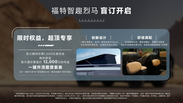 即日起至预售开启前,消费者仅需通过“福特纵横小程序”支付1000元意向金,即可在购车时获赠价值12,000元的“一键升顶露营选装包”。该选装包包含了行业首创的原厂电动举升车顶和前排座椅头枕一键自动翻折两项核心功能,将车辆变为一个集“一卧、一厨、一厅”于一体的移动生活空间。